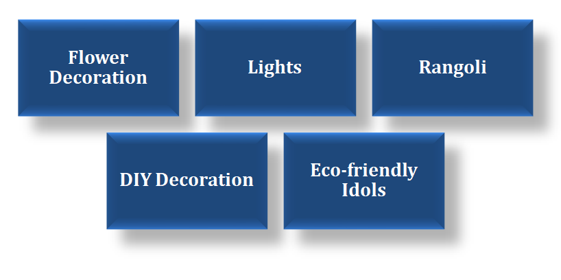 People decorate their homes with flowers, lights, rangoli, and eco-friendly idols. DIY crafts and garlands are also popular.