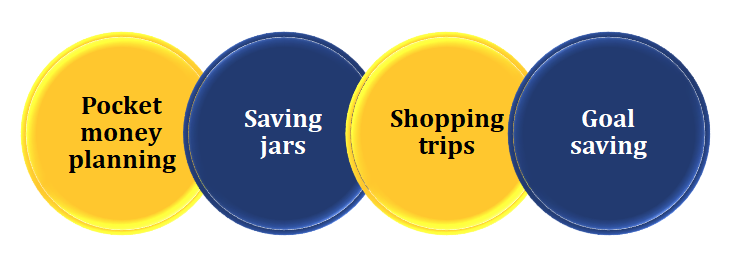 Through activities, projects, and practical lessons like budgeting, saving goals, and shopping exercises.